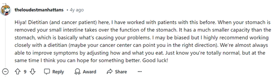 你好!我是一位营养学家(同时也是癌症患者),我以前也治疗过这样的患者。当你的胃被切除时,小肠就会接替胃的功能。它的容量比胃小得多,这基本上是导致你的问题的原因。我可能有偏见,但我强烈建议与营养师密切合作(也许你的癌症中心可以给你指明正确的方向)。我们几乎总能通过调整饮食方式和食物来改善症状。我知道你很正常,但同时我觉得你可以期待更好的。好运!